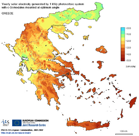 Το κέντρο Έρευνας της Ευρωπαϊκής Επιτροπής (European Commission Joint Research Center) έχει εκδώσει τον παρακάτω χάρτη ετήσιας απόδοσης Φ/Β συστημάτων.